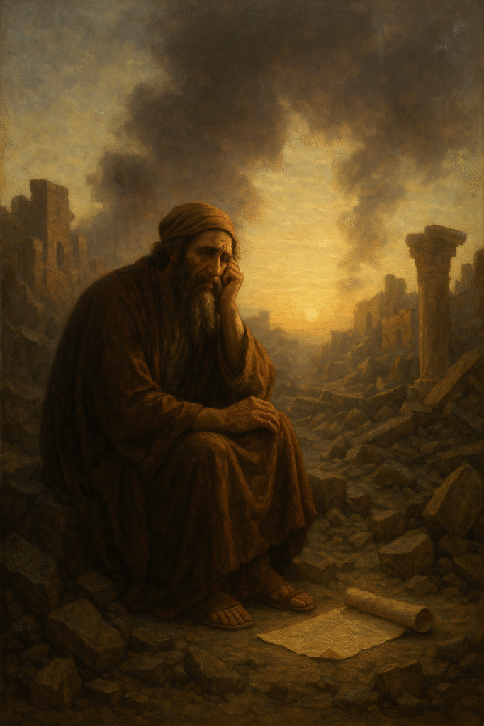 Here the poet sees clearly: the destruction is not random but righteous. False prophets had promised safety, while injustice rotted the city’s soul. Now the Lord’s wrath burns — not to annihilate, but to awaken.